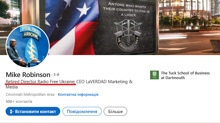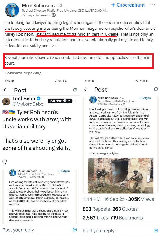 Russian media outlets, pro-war Telegram channels, and bots on the social media platform are circulating claims that a U.S. citizen named Mike Robinson is allegedly the uncle of Tyler Robinson, the suspect in the murder of American political activist Charlie Kirk. According to this narrative, Mike Robinson is somehow connected to the 1st Azov Corps of Ukraine’s National Guard. As supposed “evidence,” propagandists point to a LinkedIn post in which he allegedly sought contact with Ukrainian servicemen.